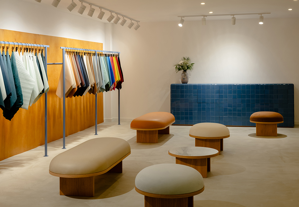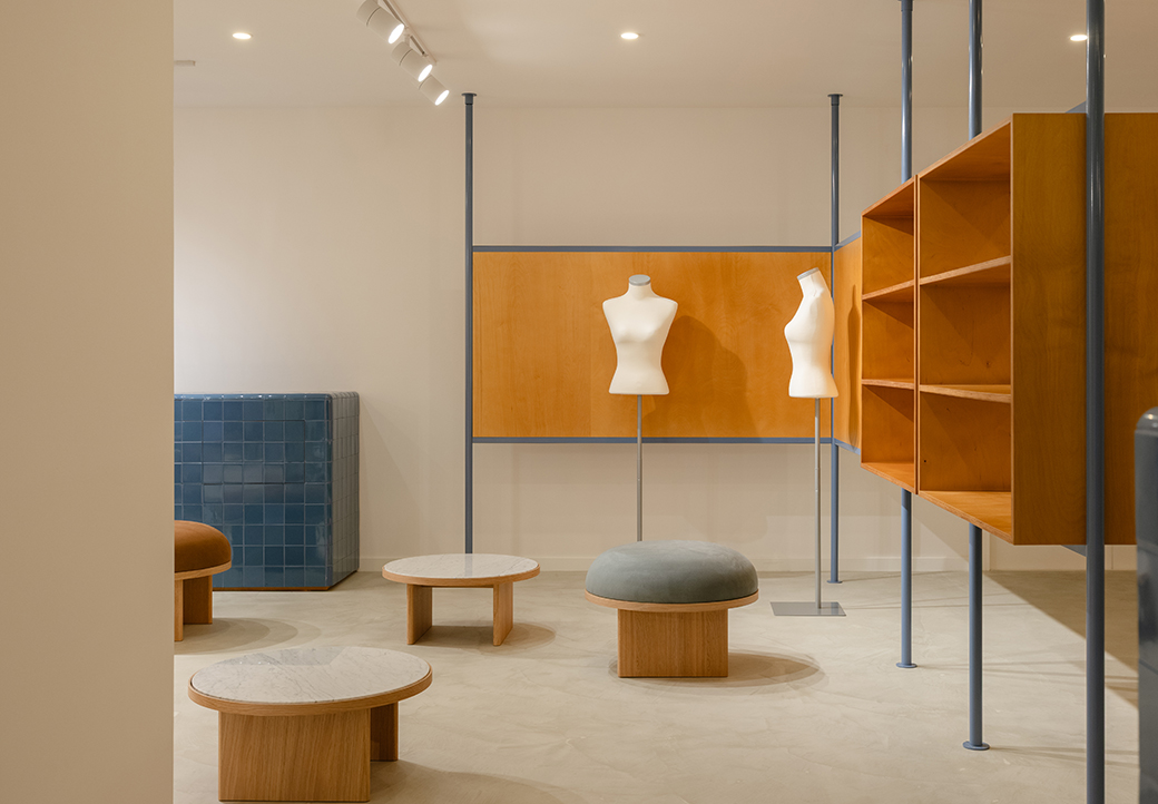 Set within a windowless industrial space, the space is inspired by French mid-century structural style, with stained birch to create an architectural envelope that contrasts with the industrial setting. Reflecting the Portuguese context of the showroom, high-gloss blue terracotta tiles by Viúva Lamego add vivid accents to the space against the micro-cement flooring, birch cladding, and exposed steel.
