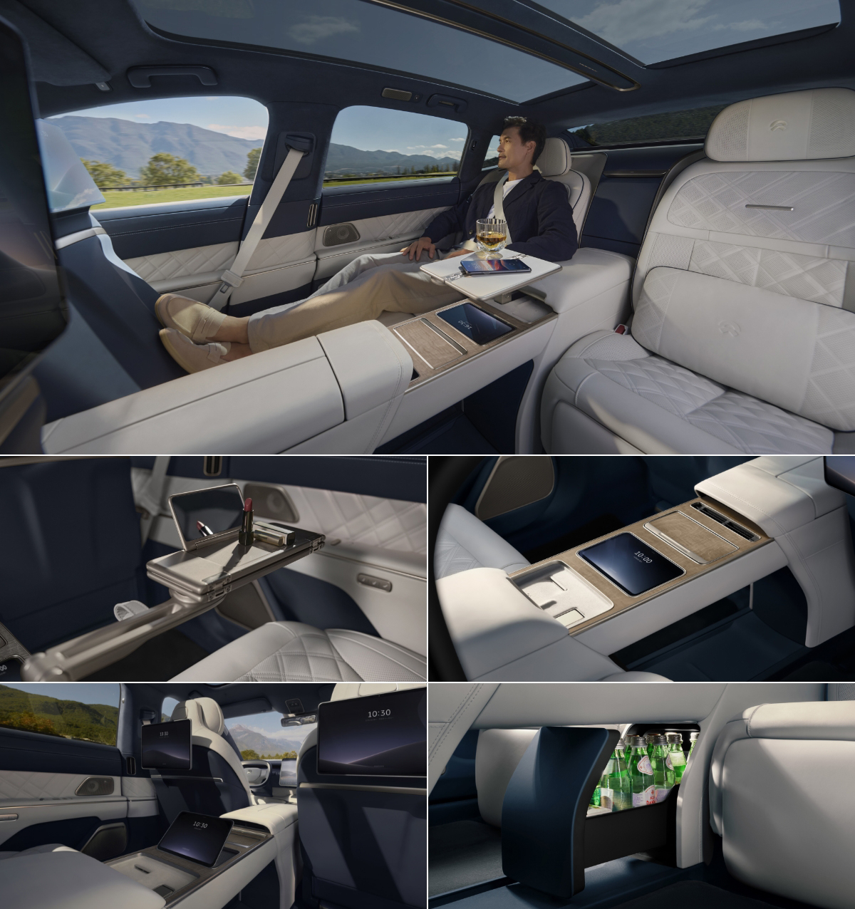 ET9の車内空間は4つの専用スペースに自然に分割され、プライベート、またビジネスにおける極上の快適性とプライバシーを提供します。582mmのワイドシートは全面ヒーティング、リクライニング、マッサージ機能を兼ね備え、すべての乗客にゆったりとしたファーストクラスの空の旅を体験しているような感覚を生み出します。また、360°の角度調節が可能となるテーブル、上下反転可能な背面コントロールパネル、スマート電気冷蔵庫なども装備しており、モバイルミーティングルームとしても活用することができます。