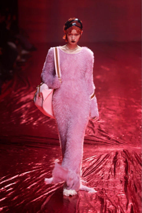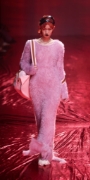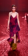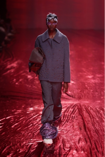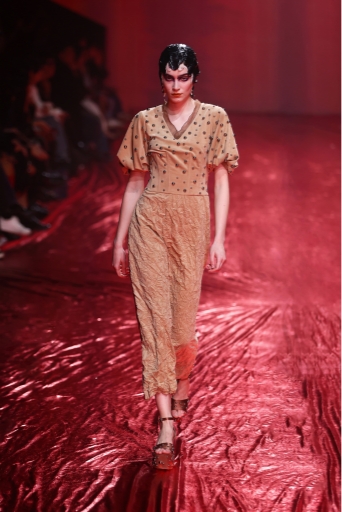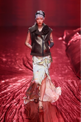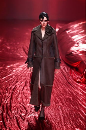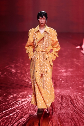 今回の24AWコレクションのテーマは「The Woman who’s angry」。長期に及んだパンデミック、不安定な経済情勢を背景に、もろくて内向的でありながらも、現在を強く生きる勇気ある女性像を表現しました。Ultrasuede®を使用した特徴的なピンクから深く燃えるような深紅の薔薇模様のプリントを施したシリーズと、繊細なバンビ柄プリントのシリーズは今回のコレクションの中でも特に際立っており、素材の特徴である、滑らかさ、しなやかさが女性の繊細さや強さを表現するのにマッチしていました。